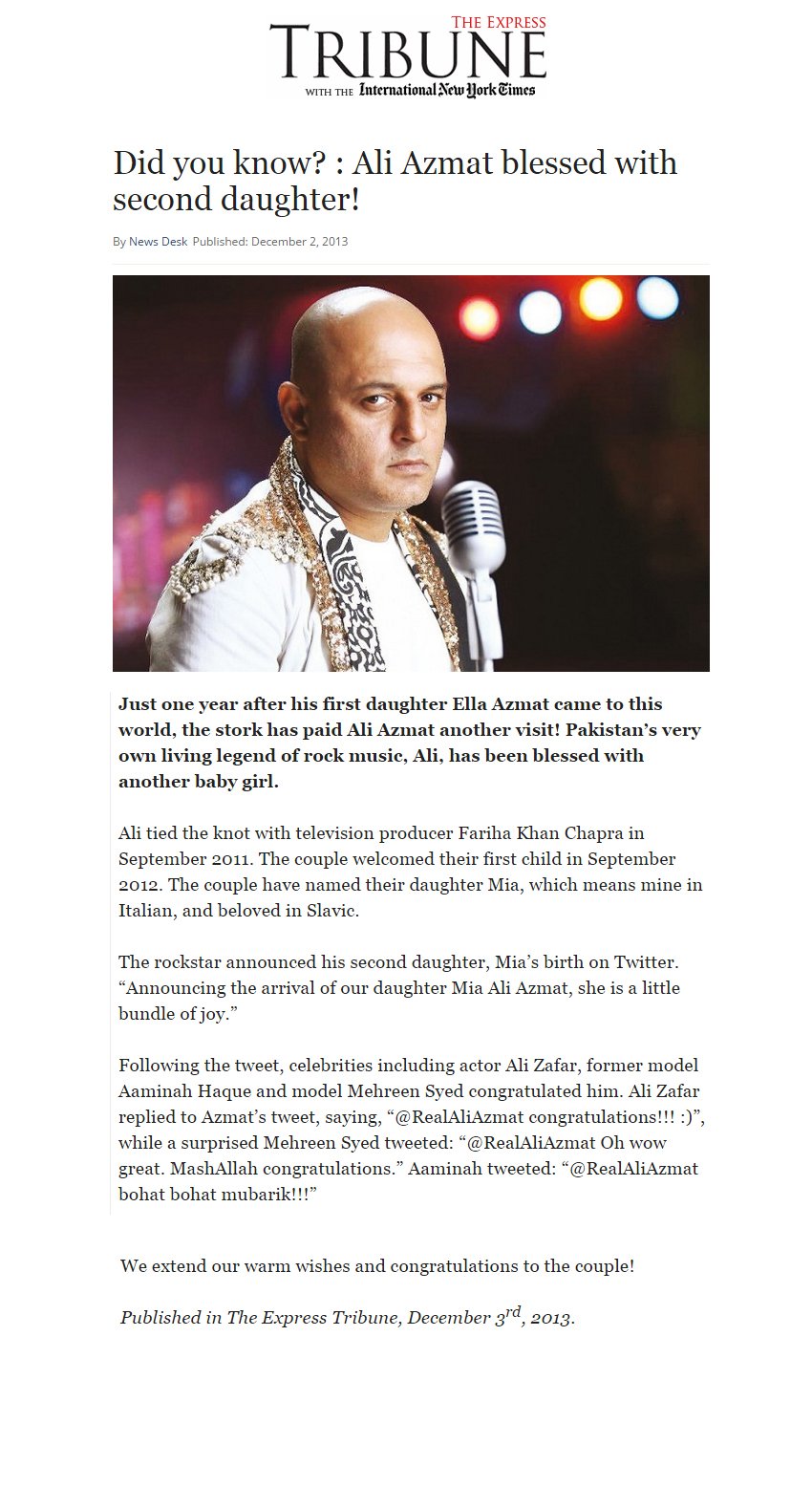 Did You Know? : Ali Azmat Blessed With Second Daughter! News Desk Published: December 2, 2010